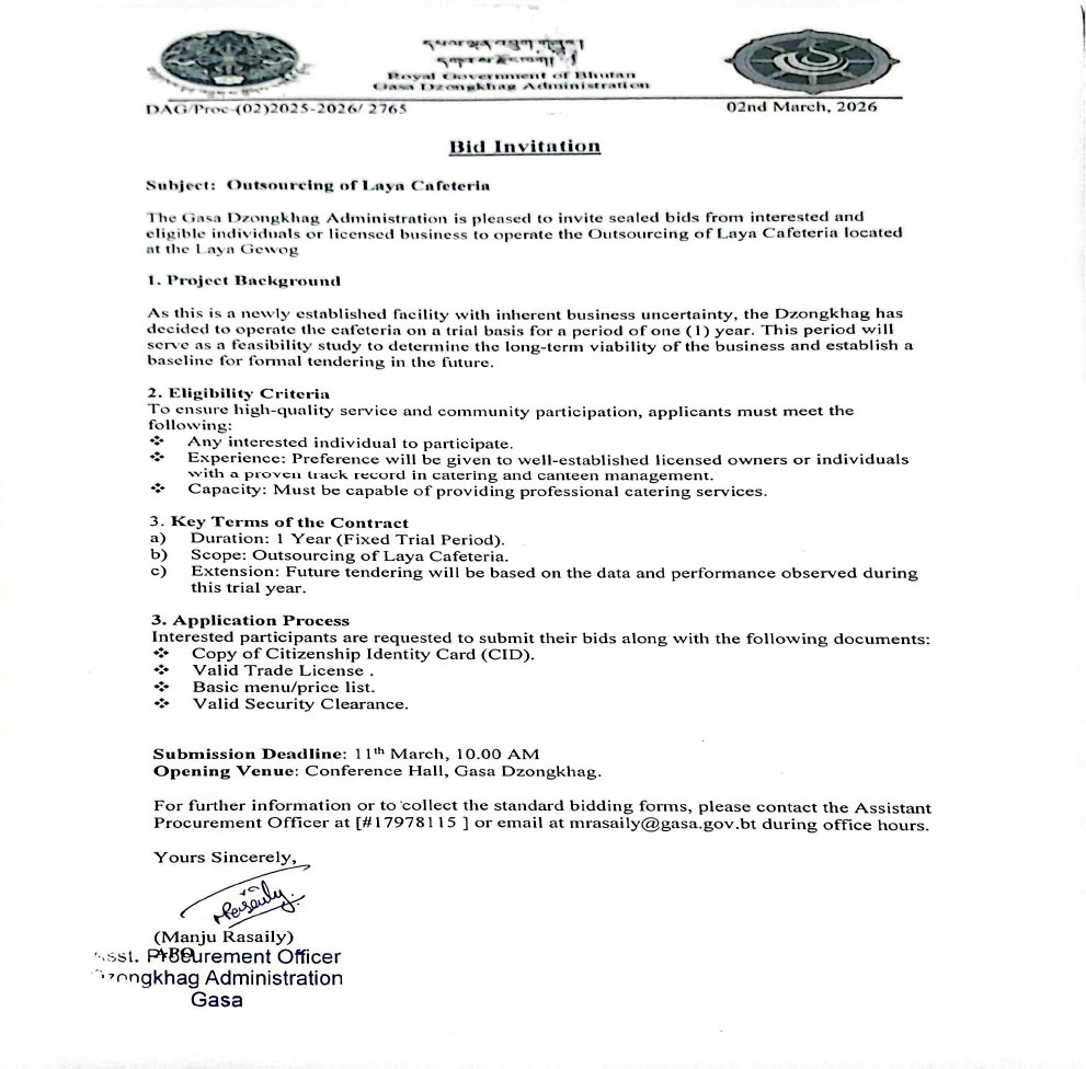 The Gasa Dzongkhag Administration invites sealed bids from eligible and interested individuals or licensed businesses for the outsourcing and operation of the Laya Cafeteria..
